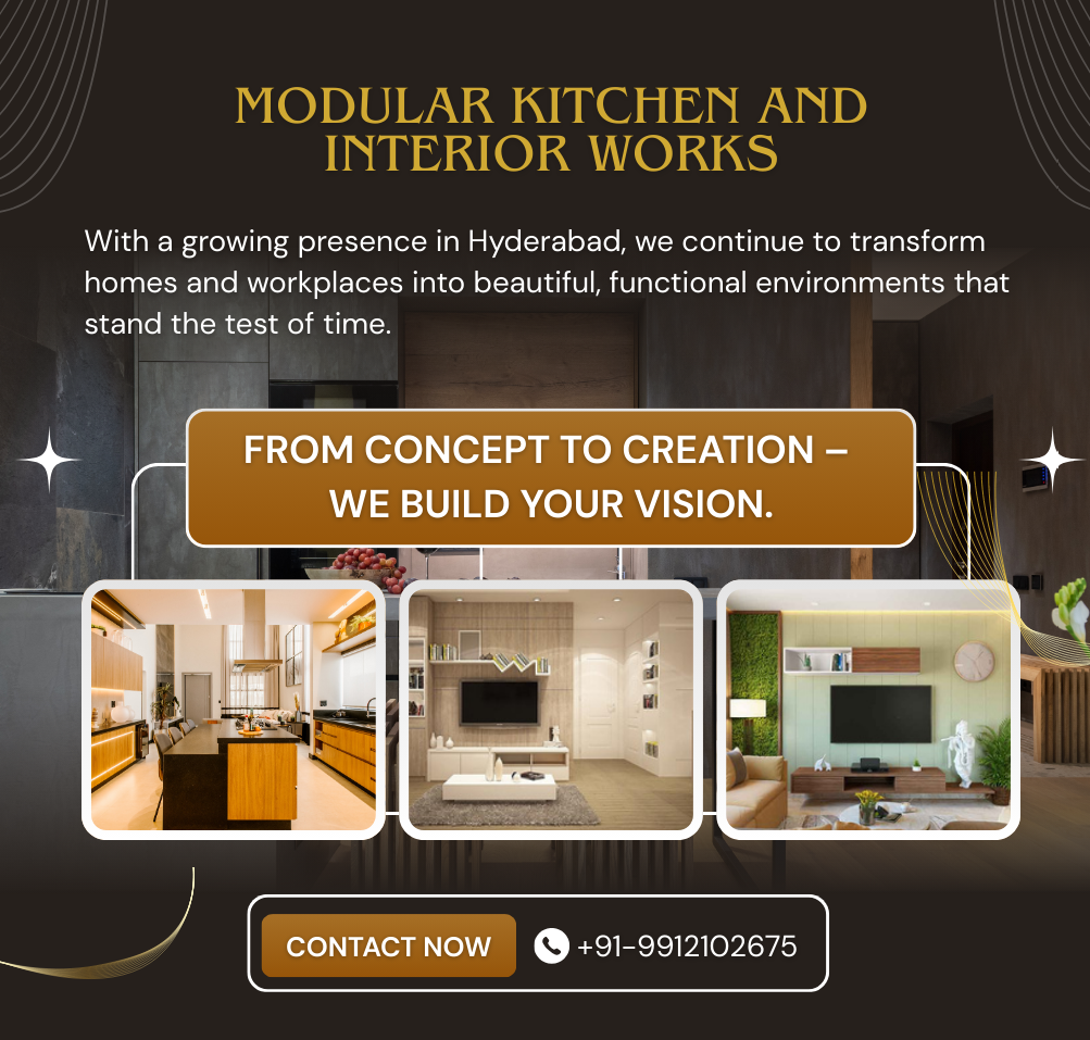 At Modular Kitchen and Interior Works, we believe that every space has the potential to become a perfect blend of functionality, comfort, and style. Based in Hyderabad, we specialize in delivering high-quality modular kitchen solutions and complete interior works that are thoughtfully designed to suit modern lifestyles. With a deep understanding of evolving design trends and practical needs, we focus on creating spaces that are not only visually appealing but also highly efficient and personalized to each client’s requirements.